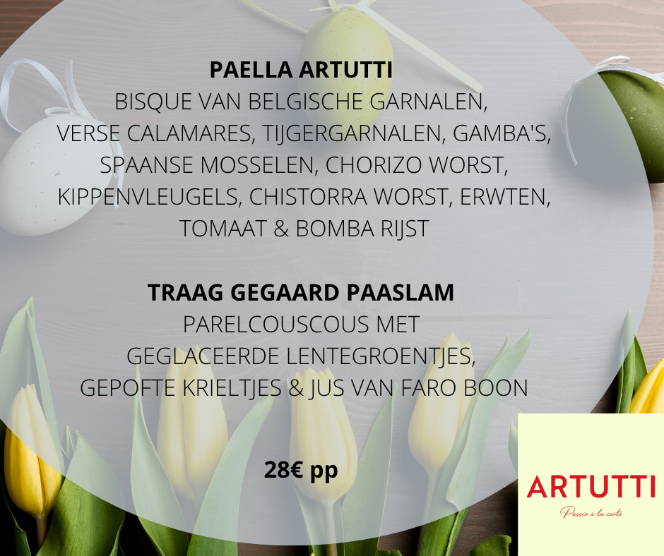 bestellen kan tot woensdagmiddag 1 april - tis geen grapje :-) - door een mailtje te sturen naar info@artutti.be of via whatsapp naar 0478 88 79 24 (28€/per portie). Met vermelding van naam, aantal porties per gerecht & GSM nummer.De betaling kan cash of via payconicq bij afhaling.Afhalen kan in atelier Artutti (Ninoofsesteenweg 32 1500 Halle) op zaterdag 4 april tussen 14u en 15u.